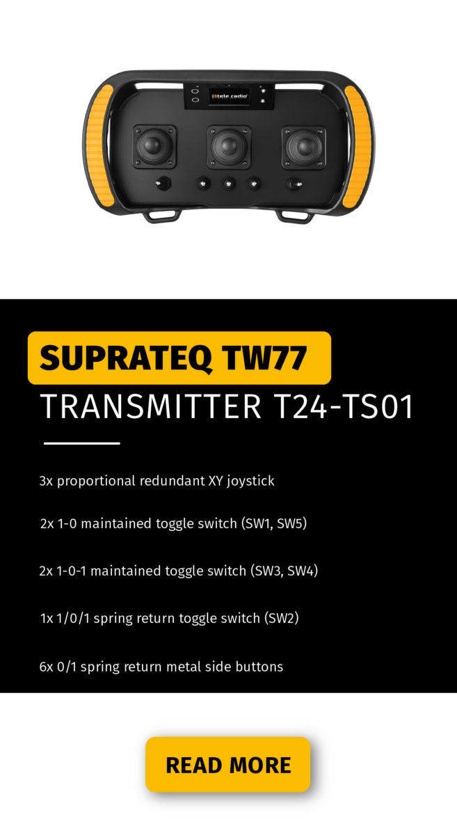 Depending on your application you can choose the SupraTEQ TW77 Basic Line models or opt for a Custom Line solution. This offers you full freedom in configuring your hardware and software within this transmitter housing and the associated receivers. You can even upgrade your system to a larger 4.3 inch display (SupraTEQ TW78 Custom Line). Our Tele Radio Sales Department can advise you on the best solution for your job.
