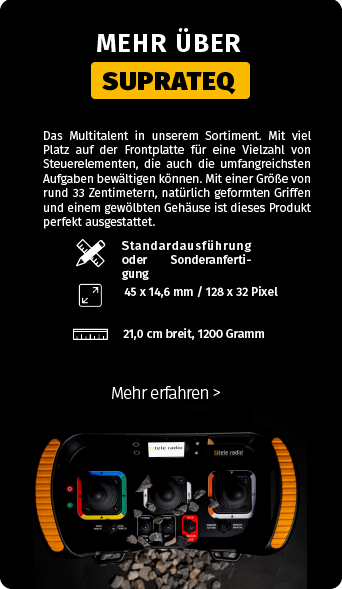 Unsere TEQ-Sender sind in drei verschiedenen Größen erhältlich. Bei allen Varianten gibt es Standard- und kundenspezifische Ausführungen. Sie haben die Wahl: Entweder Sie entscheiden sich für einen kompakten und damit handlichen Sender oder für eine der größeren Varianten. Hier haben Sie genügend Platz um alle gängigen Bedienelemente wie z. B. Drucktasten, Joysticks, Linearhebel, Potentiometer usw. zu integrieren. Außerdem verfügt die SUPRATEQ-Linie über zwei verschiedene Display-Größen (bis zu 4.3 Zoll). So haben Sie alle Rückmeldungen der zu steuernden Maschine oder des zu steuernden Fahrzeugs bestens im Blick.