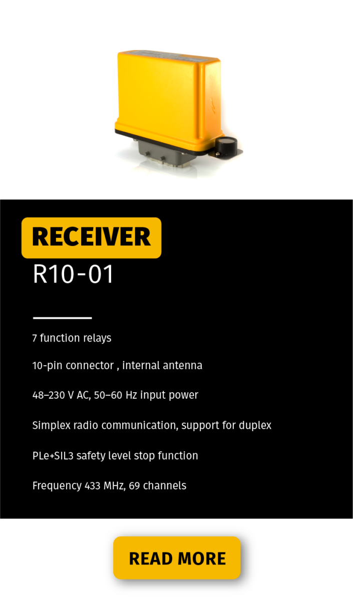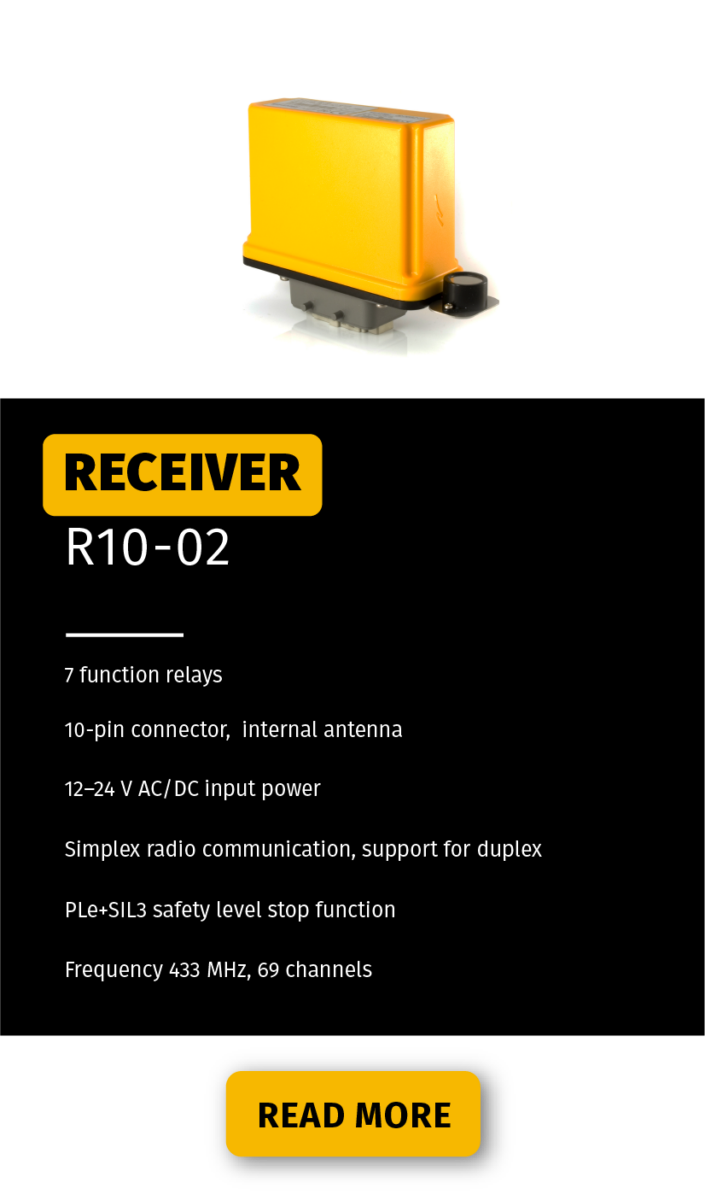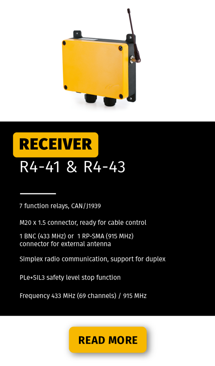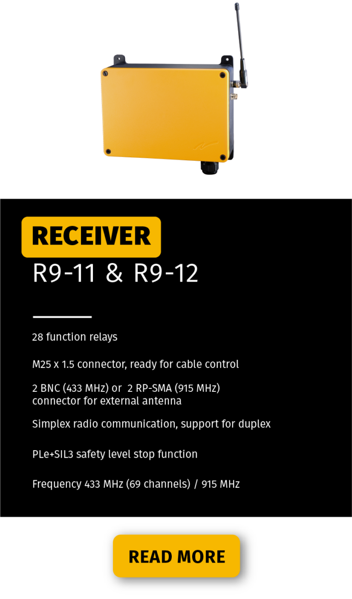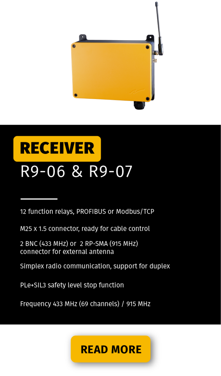 Our system wouldn’t be complete without a wide range of receivers. We can offer smaller seven relay receivers up to very large receivers with 28 relays. In this range you will also find receivers with bus technology: Profibus, Modbus, CANopen and J1939. There is also the option of an analog receiver which supports step less control. Furthermore we also have receivers that can plug-in directly to an application that supports a 10-pin Harting connector. All receivers have high quality casings at IP65 or IP66.