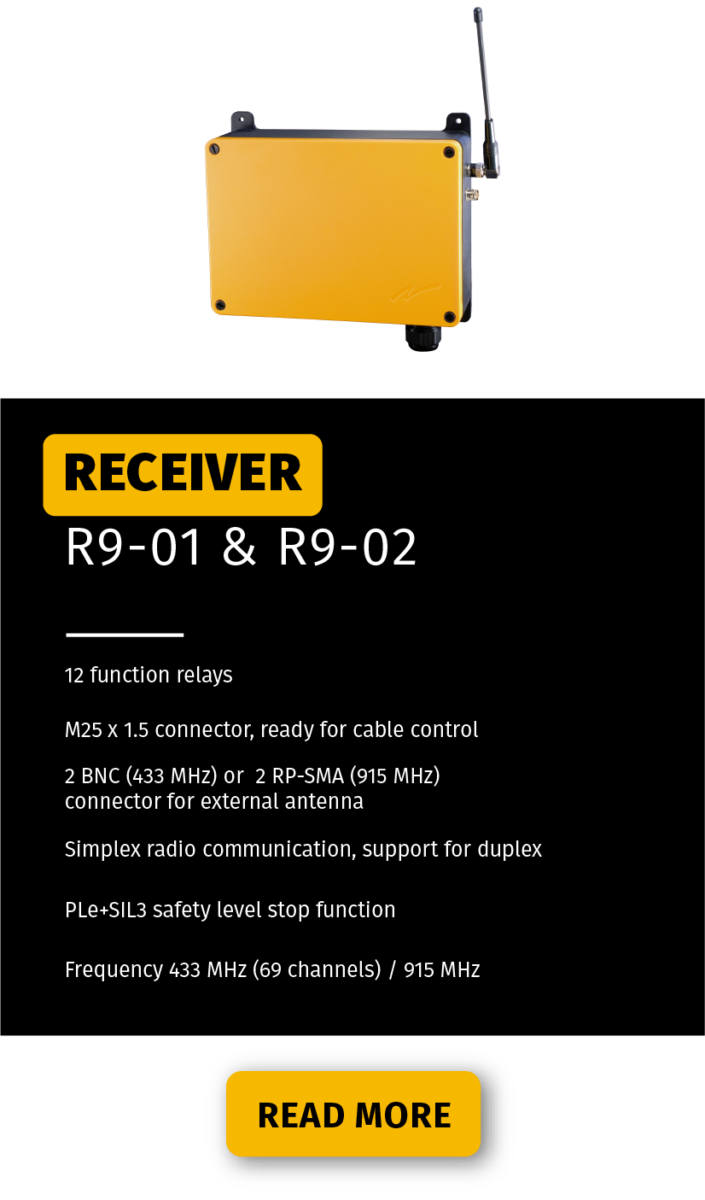 Our system wouldn’t be complete without a wide range of receivers. We can offer smaller seven relay receivers up to very large receivers with 28 relays. In this range you will also find receivers with bus technology: Profibus, Modbus, CANopen and J1939. There is also the option of an analog receiver which supports step less control. Furthermore we also have receivers that can plug-in directly to an application that supports a 10-pin Harting connector. All receivers have high quality casings at IP65 or IP66.