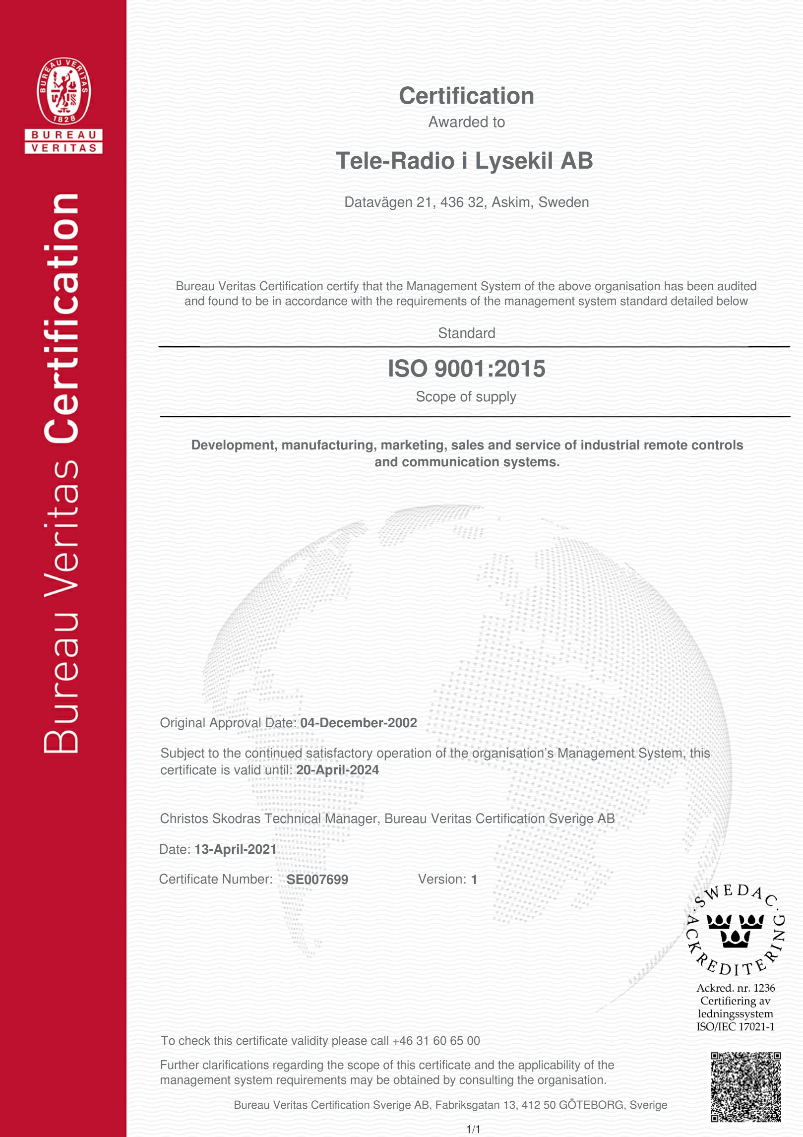 Tele Radio está certificada de acuerdo con el sistema de gestión de calidad ISO 9001 y el sistema de gestión ambiental ISO 14001 para un control remoto seguro. Esto significa que puede confiar en nuestra capacidad y conocimiento para llevar a cabo el trabajo que desarrollamos, que trabajamos continuamente para evitar que los errores se repitan, que utilizamos tantos componentes ecológicos como sea posible y que utilizamos los mejores medios de transporte disponibles, tanto para viajes de negocios como para el transporte de mercancías, por el bien del medio ambiente.