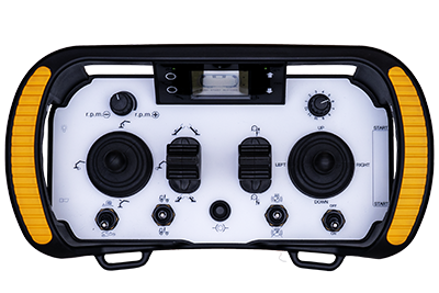 La gama estándar de TEQ consiste en 3 tipos de transmisores de control remoto que incluyen: alertas mediante vibración y alarmas, comunicación duplex, seta de paro en el lateral, conector macho/hembra tipo M12, placa frontal estándar con símbolos blancos, LEDs en las asas para iluminar el panel, 2 baterías Li-Ion con estación de carga, adaptadores de alimentación para vehículos y universales de pared (USA, UK, Europa…) y correa/cinturón para colgar el mando y llevarlo cómodamente.