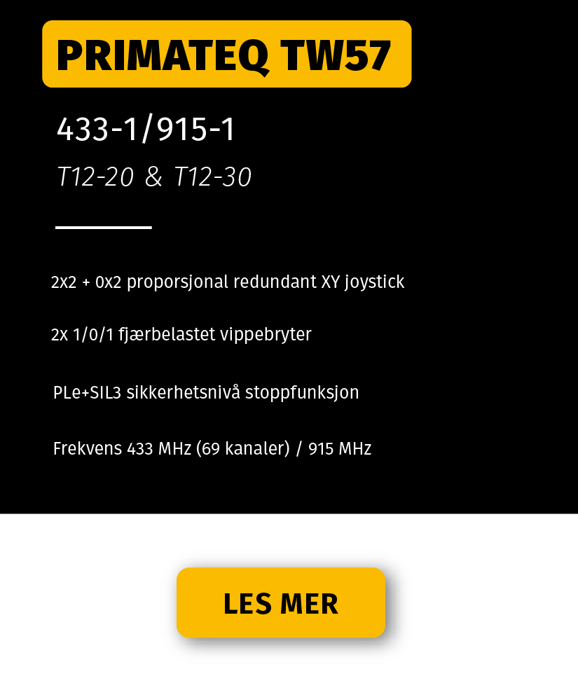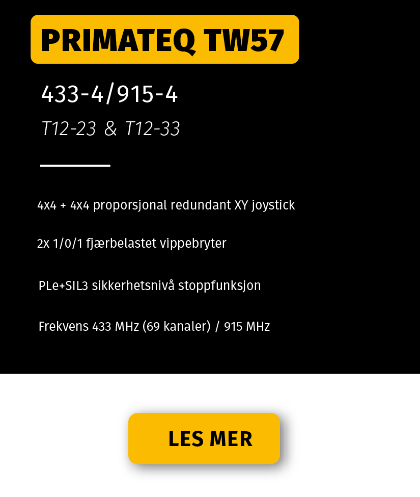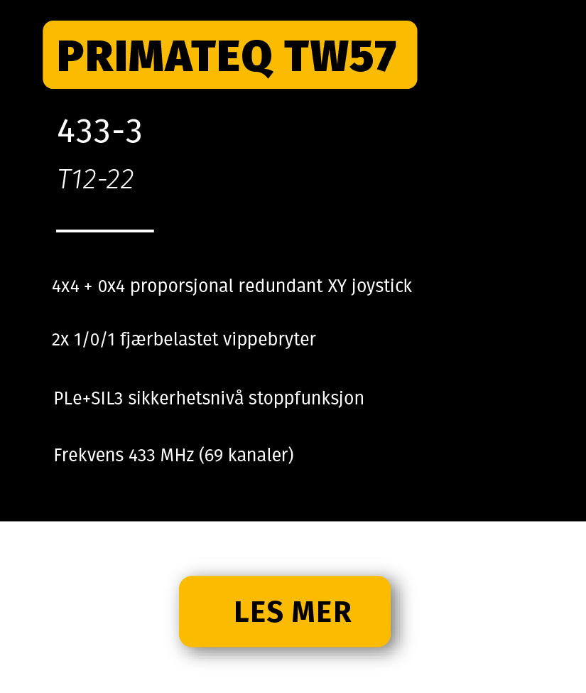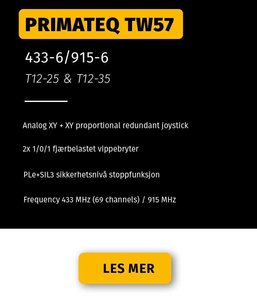 Å styre en kran eller maskin med radiostyring og fortsatt ha begge hendene fri til andre oppgaver, er bare en av mange grunner til å velge PrimaTEQ joysticksender. PrimaTEQ er lett gjenkjennelig med sin bredde på 21 centimeter og monokrome skjerm på 4,5 x 1,5 centimeter. Den kompakte størrelsen gjør senderen perfekt for langtidsbruk under tøffe forhold. PrimaTEQ har en solid kapsling med ergonomiske håndtak, uavhengig sertifisert til PLe/SIL3 sikkerhetsnivå, stoppfunksjon og forhåndsprogrammerte løfte- og heiseinnstillinger. Med mer enn 10 forskjellige joystick-versjoner, som opererer på enten 433 eller 915 MHz, er det en standard Basic Line-versjon. Eller man kan sette sammen en PrimaTEQ-sender etter eget ønske dersom man velger en Custom Line-versjon.