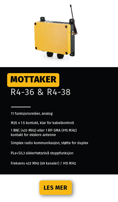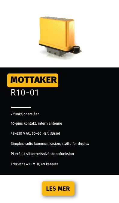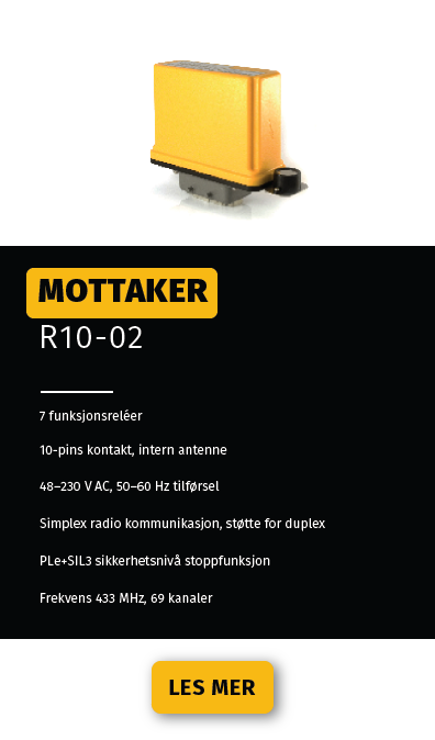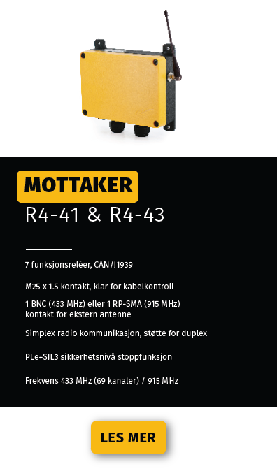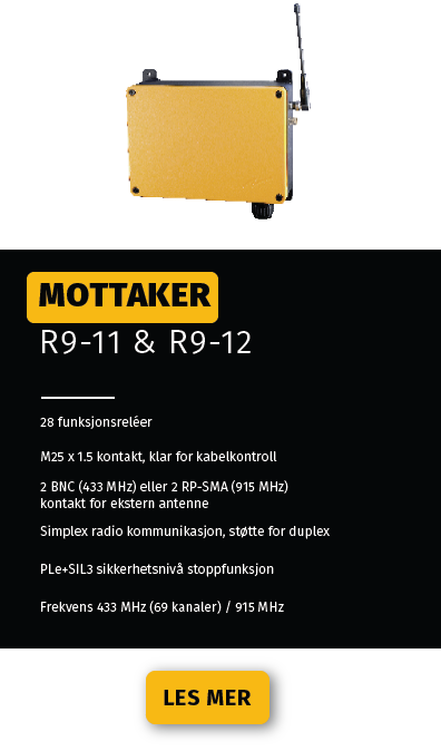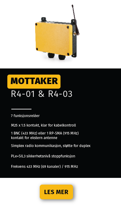 Systemet ville ikke vært komplett uten et bredt utvalg av mottakere også. Vi har mindre mottakere med 7 reléer og opp til veldig store mottakere med 28 reléer. I denne serien finner du også mottakere med BUS-teknologi: Profibus, Modbus, CANopen og J1939. Det er også mulighet for en analog mottaker som støtter trinnløs kontroll. I tillegg har vi også mottakere som kan plugges direkte inn i en applikasjon som bruker 10-pins Harting-kontakt. Alle mottakere har kapslinger av høy kvalitet i IP65 eller IP66.