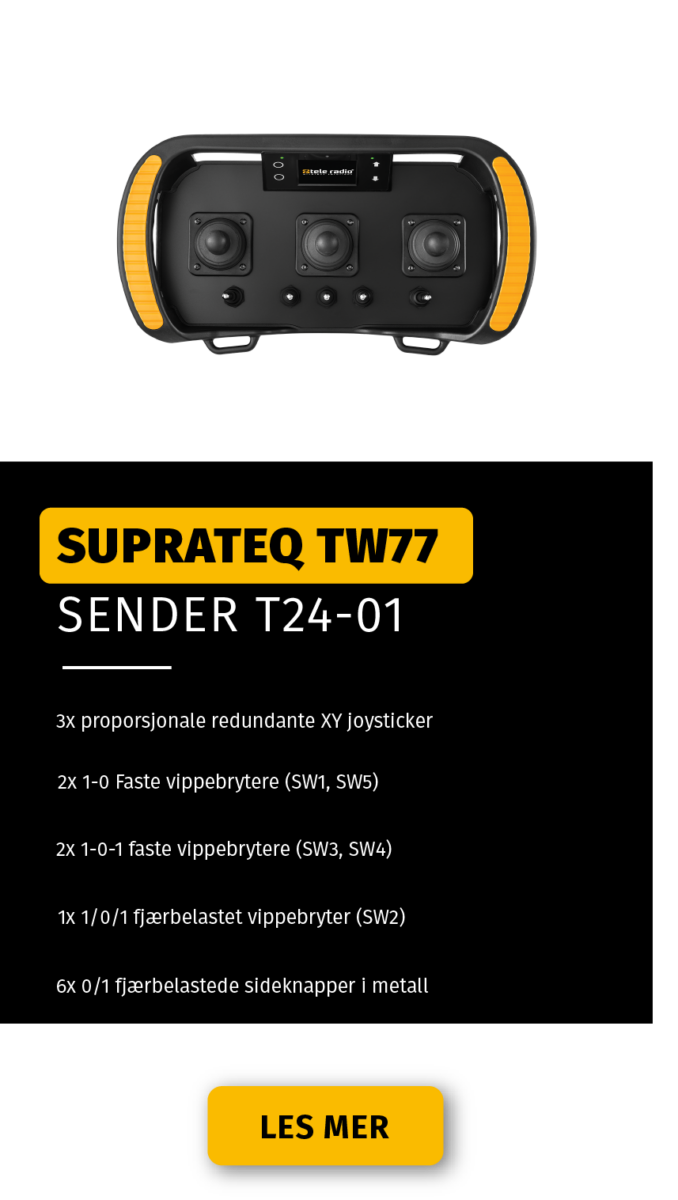 SupraTEQ er vår toppmoderne allrounder innenfor produktspekteret av joysticksendere. Rundt 33 centimeter i størrelse med naturlige formede grep og en buet, ergonomisk utformet kapsling. På grunn av størrelsen tilbyr den god plass på frontplaten for et stort antall kontrollelementer som kan håndtere de mest omfattende applikasjoner. SupraTEQ er din løsning for å kontrollere komplekse hydrauliske, mobile og industrielle maskinerier. SupraTEQ er robust og sikker, dette fordi vi har standard, uavhengig sertifisert SIL3, PLe+Cat3 sikkerhetsnivå stoppfunksjon.