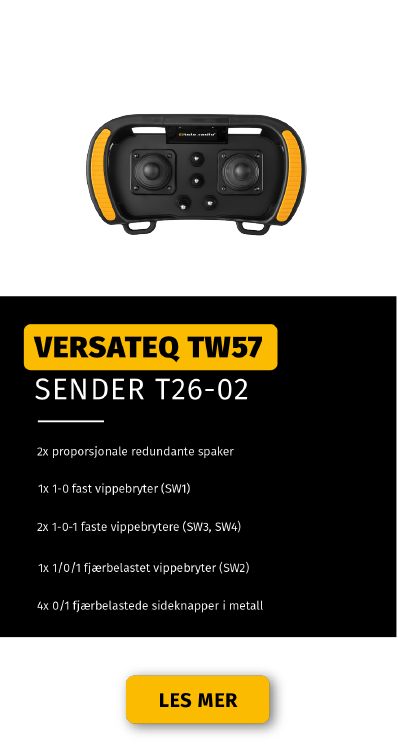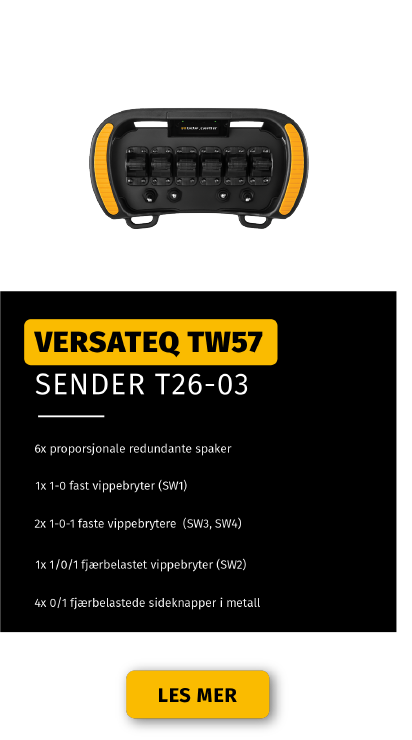 Vår innovative mellomstore løsning for joysticksendere med en jevn og ergonomisk design. Senderen er 24 centimeter bred. Utstyrt med håndtak som følger de naturlige kurvene til hendene. For din sikkerhet, er hver av VersaTEQ-sendere utstyrt med en uavhengig sertifisert PLd+Cat3-stoppfunksjon. VersaTEQ er robust, allsidig og fleksibel for mange operasjoner. Basert på 60 års kunnskap utviklet Tele Radio denne produktserien for hydrauliske, mobile og industrielle applikasjoner.