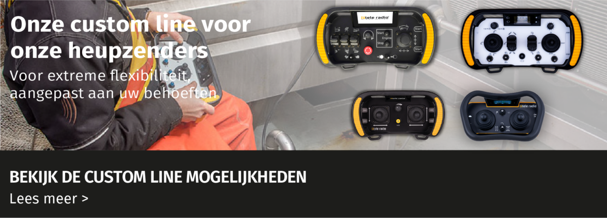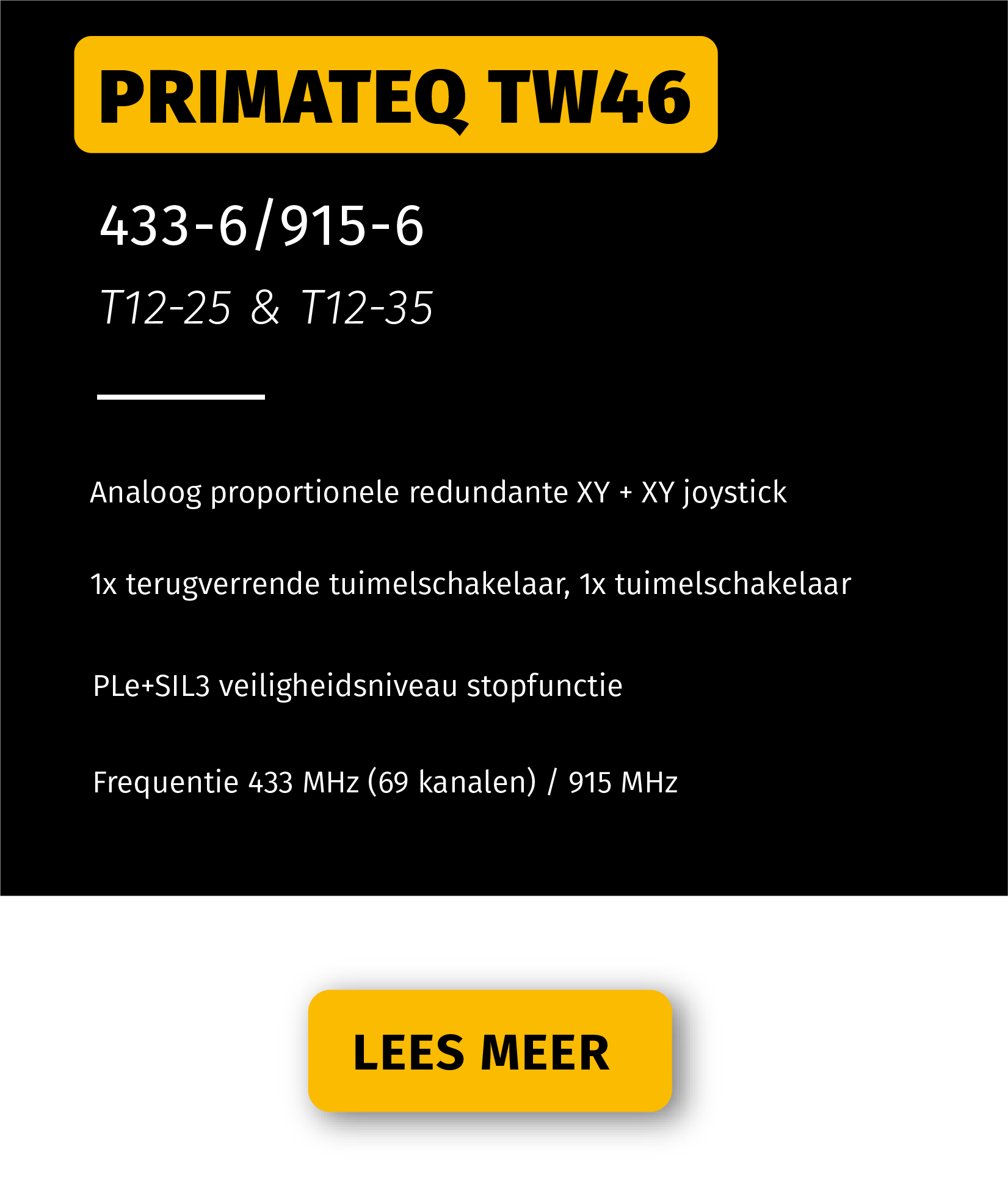 Een kraan of machine op afstand bedienen en nog steeds beide handen vrij hebben voor andere taken, dat is de kracht van een heupzender zoals de PrimaTEQ. De PrimaTEQ is herkenbaar aan zijn breedte van 21 centimeter en monochroom scherm van 4,5 bij 1,5 centimeter. Het compacte formaat maakt de zender perfect voor langdurig gebruik in ruwe omstandigheden. De PrimaTEQ biedt een stevige behuizing met ergonomische handgrepen, een onafhankelijk gecertificeerde, PLe/SIL3 veiligheidsniveau, stopfunctie en voorgeprogrammeerde hijs- en hefinstellingen. Met meer dan 10 verschillende joystick-versies, die werken op 433 of 915 MHz, is er een standaard Basic Line-versie. Optioneel kan een PrimaTEQ-zender naar wens worden samengesteld als een Custom Line-versie wordt gekozen.