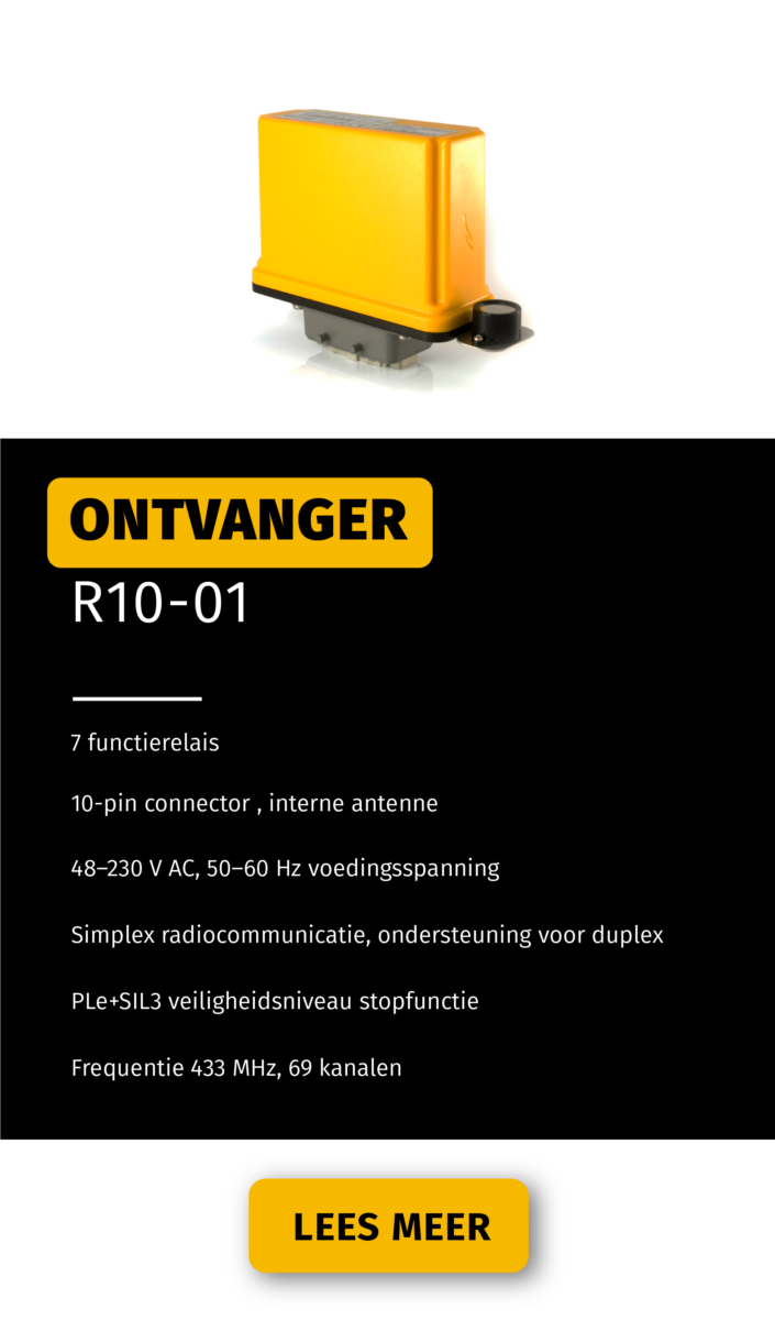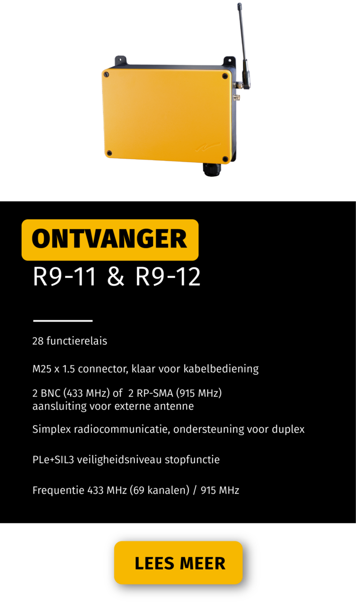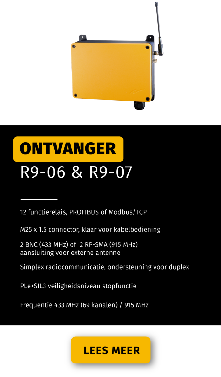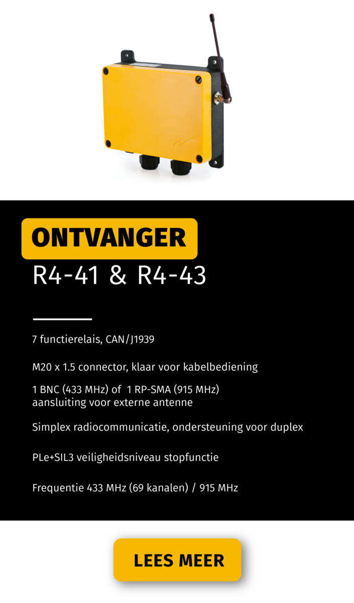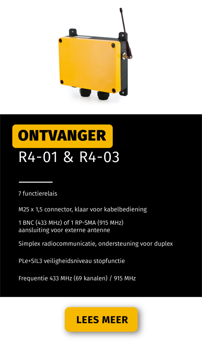 Ons systeem is niet compleet zonder een breed scala aan ontvangers. We bieden kleinere zeven-relais ontvangers tot zeer grote ontvangers met 28 relais. In deze reeks vindt u ook ontvangers met bus technologie: Profibus, Modbus, CANopen en J1939. Er is ook de optie van een analoge ontvanger die traploze regeling ondersteunt. Bovendien hebben we ook ontvangers die direct kunnen worden ingeplugd op een toepassing die een 10-pin Harting-connector ondersteunt. Alle ontvangers hebben hoogwaardige behuizingen met IP65 of IP66.