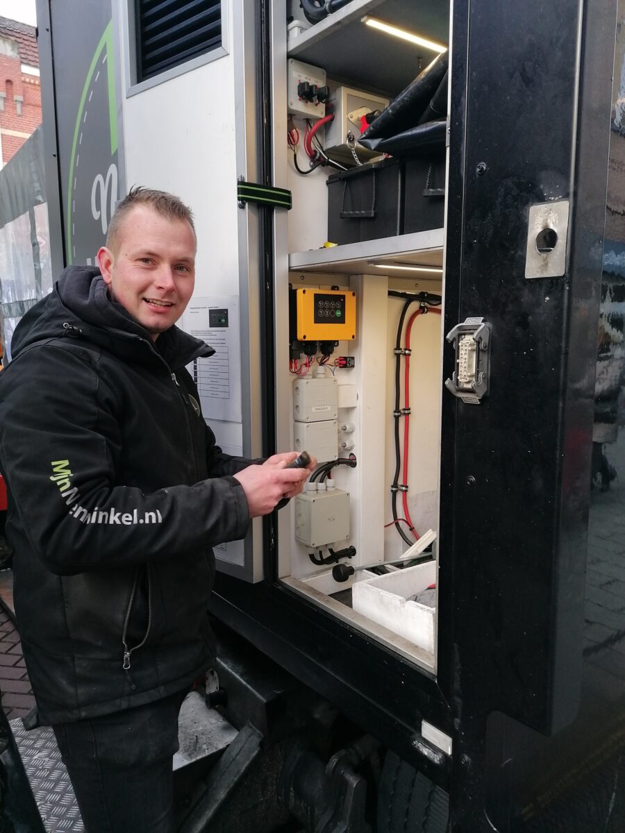 Joery Cozijnsen bij de draadloze techniek aan de voorzijde van de verkoopwagen.