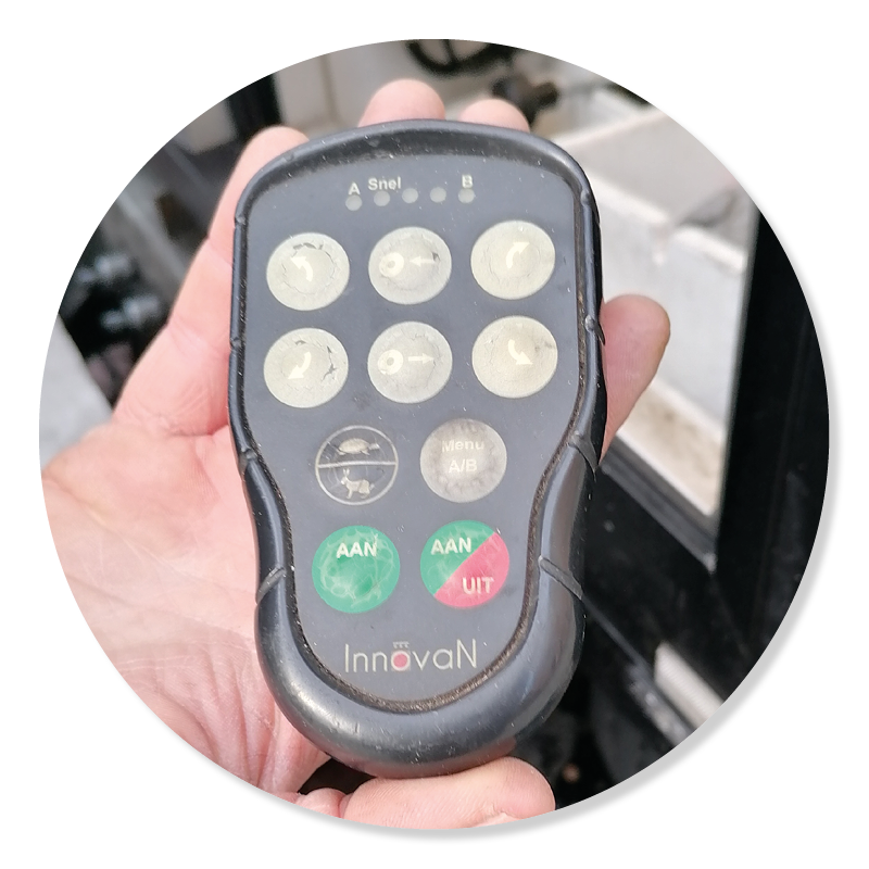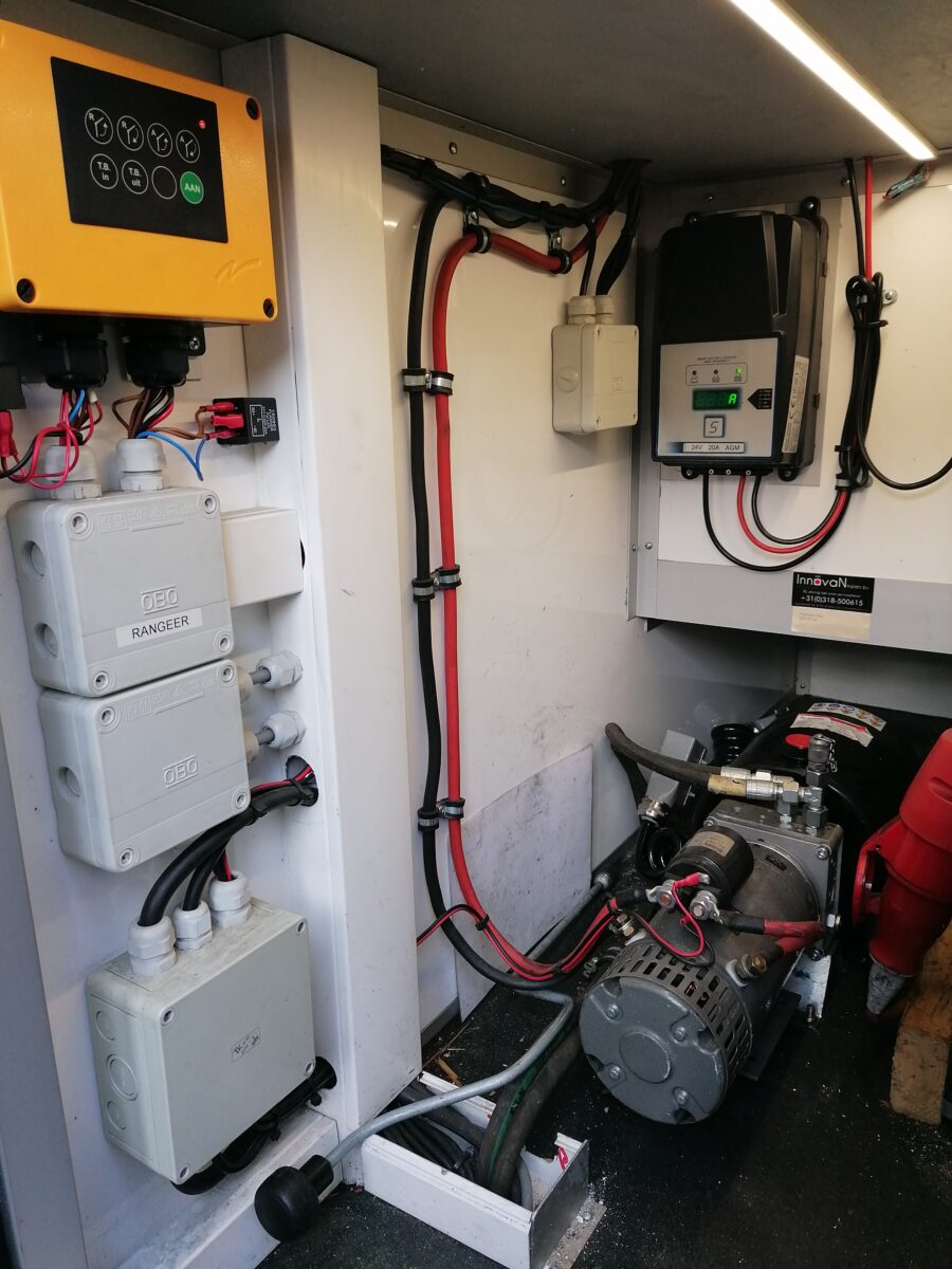 De techniek achter dit draadloos stukje vernuft zit vooraan in de verkoopwagen ingebouwd. “Mochten beide afstandsbedieningen er onverhoopt mee ophouden dan kan ik de wagen nog bedienen met dit gele kastje voorin de wagen”, wijst Joery. “Maar dit kastje gebruik ik dus alleen in geval van nood.” Het systeem draait op twee accu’s die eveneens in de wagen verwerkt zitten. Daardoor is de verkoopwagen deels zelfvoorzienend qua elektriciteit. “Maar voor de ledverlichting in de kraam heb ik wel stroom van buitenaf nodig.”