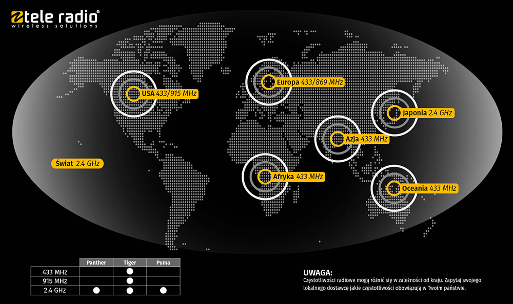 System sterowania Tele Radio Tiger G2 pracuje na częstotliwości 433 MHz, 915 MHz oraz 2,4 GHz. Systemy sterowania Panther oraz Puma na 2,4 GHz.