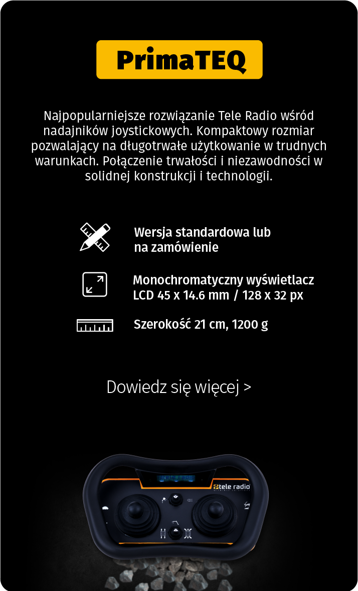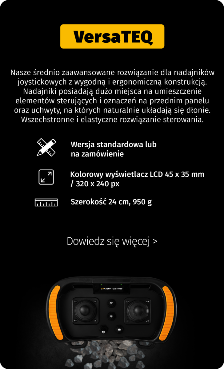 Nadajniki z manipulatorami Tele Radio dostępne są w trzech rozmiarach oraz w wersji standardowej lub tworzonej „pod klienta”, w której wykorzystuje się przyciski, przełączniki, joysticki, joysticki łopatkowe itp. Do wyboru jest więc kompaktowy i poręczny nadajnik oraz ten w większej wersji zawierającej dużo miejsca na wszelkie dodatkowe elementy sterujące oraz wyświetlacz o przekątnej do 4,3 cala, na którym wyświetlane są informacje zwrotne ze sterowanej maszyny lub pojazdu.