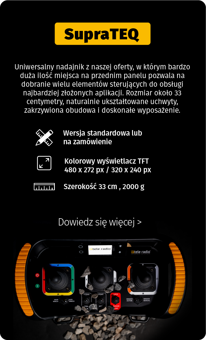 Potrzebujesz nadajnika do (mniej lub bardziej) standardowych zastosowań? Jeśli tak, zalecamy wybór podstawowej wersji PrimaTEQ, VersaTEQ lub SupraTEQ Basic Line. Nadajniki te mają stały zestaw elementów sterujących, łatwo się dostosowują, posiadają niezależnie certyfikowaną funkcję zatrzymania awaryjnego i oferują najlepszy stosunek ceny do jakości. Aby spełnić aktualne standardy branżowe, nadajniki joystickowe Tele Radio są kompatybilne z szeroką gamą systemów BUS.