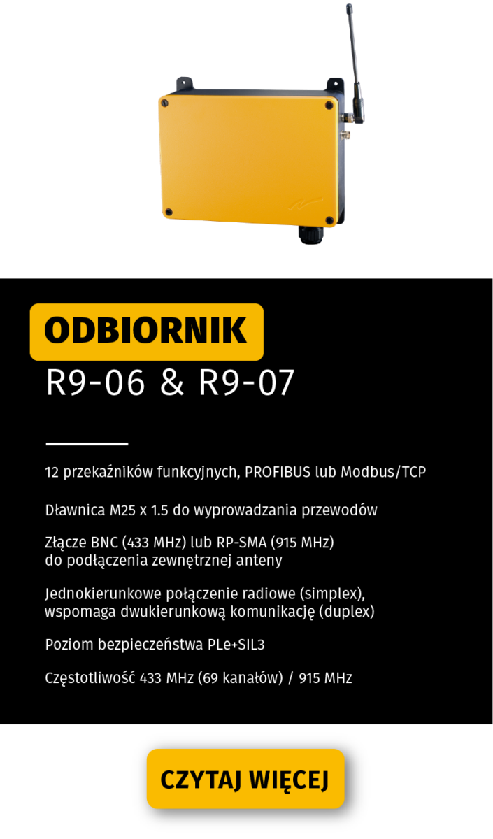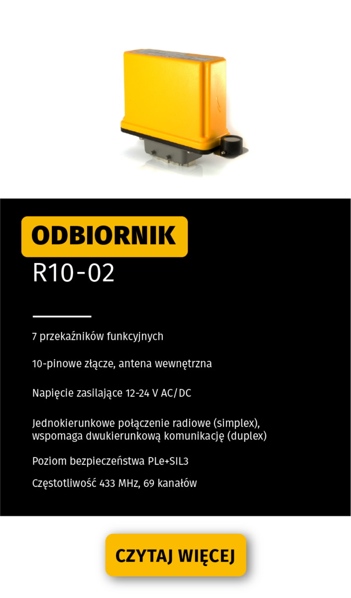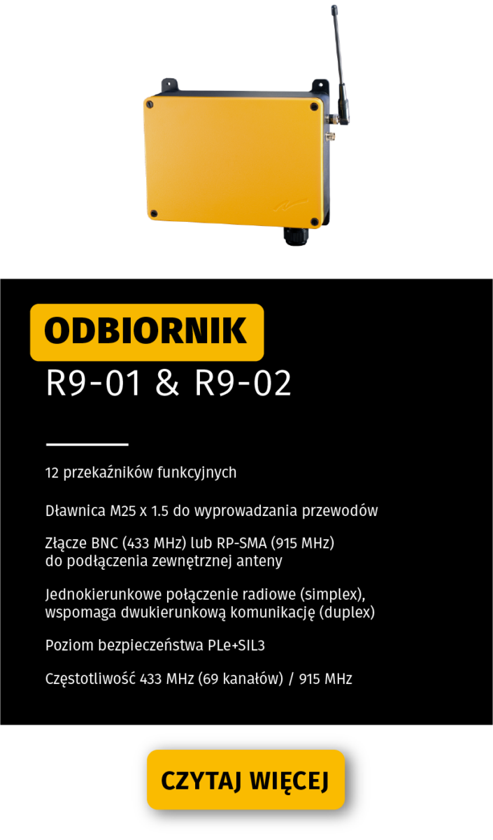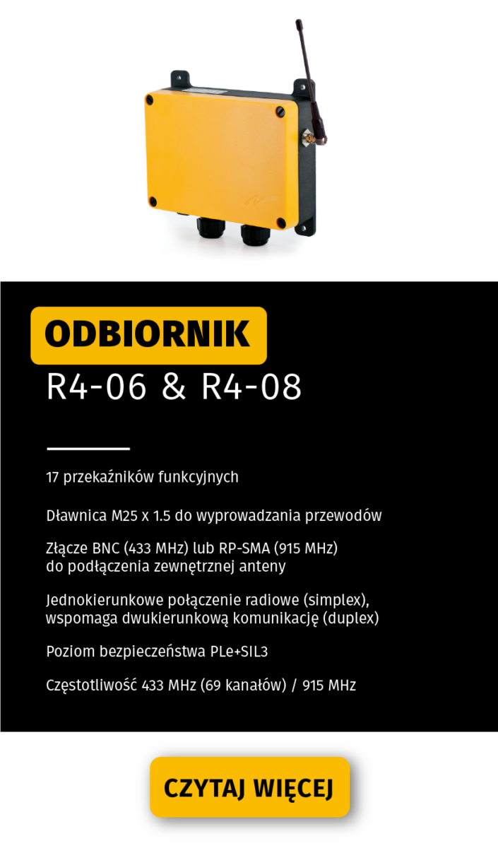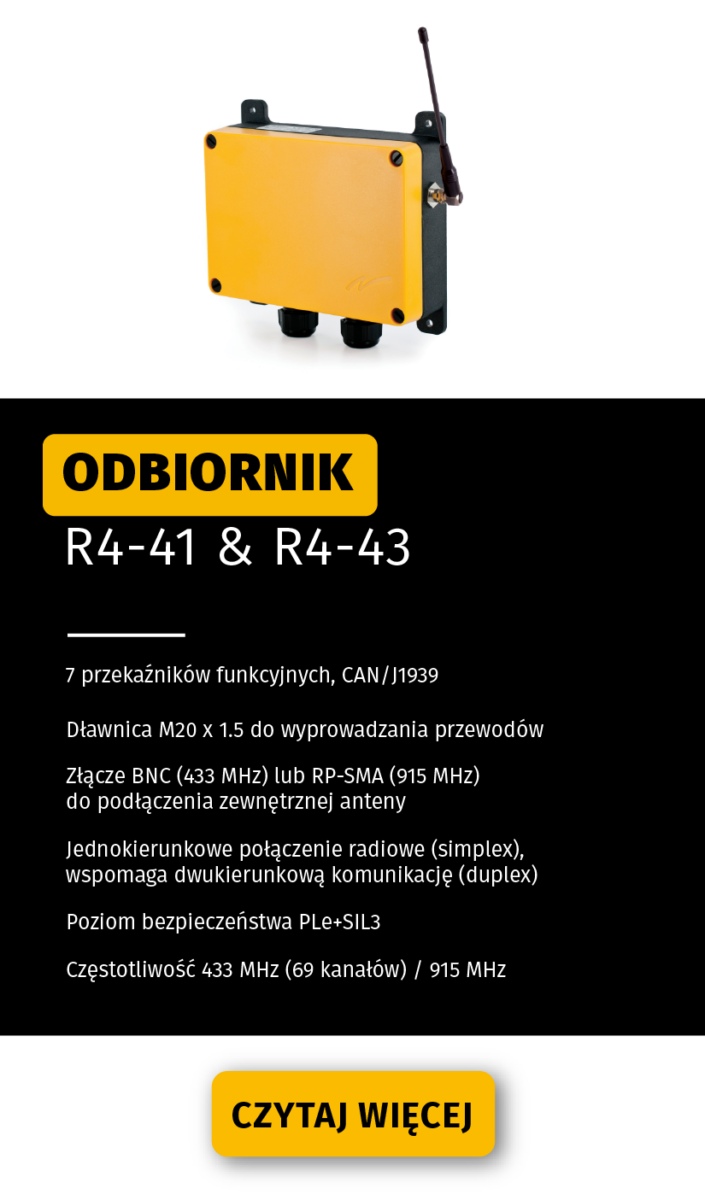 Nasz system nie byłby kompletny bez szerokiej gamy odbiorników, zaczynając od tych z siedmioma przekaźnikami, a na bardzo dużych, 28-przekaźnikowych, kończąc. W ofercie można znaleźć odbiorniki dla różnych systemów magistrali BUS: Profibus, Modbus, CANopen oraz J1939. Istnieje również możliwość zastosowania odbiornika analogowego, który obsługuje sterowanie bezstopniowe lub odbiornika bezpośrednio podłączonego do aplikacji obsługującej 10-pinowe złącze Harting. Wszystkie odbiorniki posiadają wysokiej jakości obudowy o szczelności IP65 lub IP66.