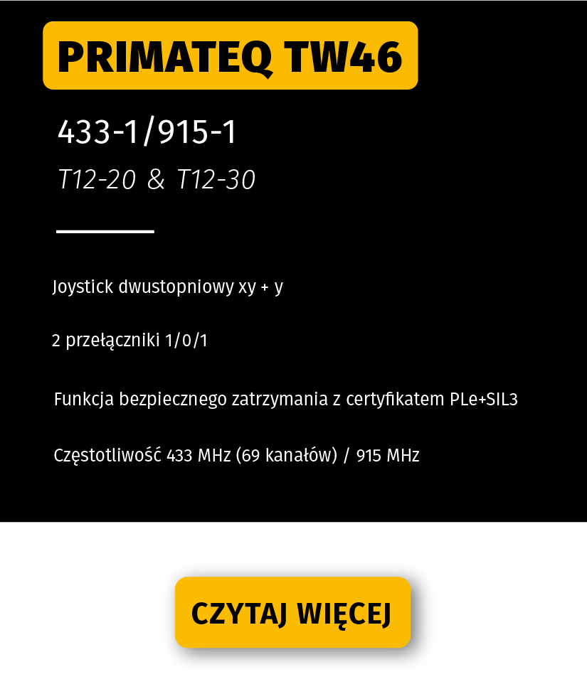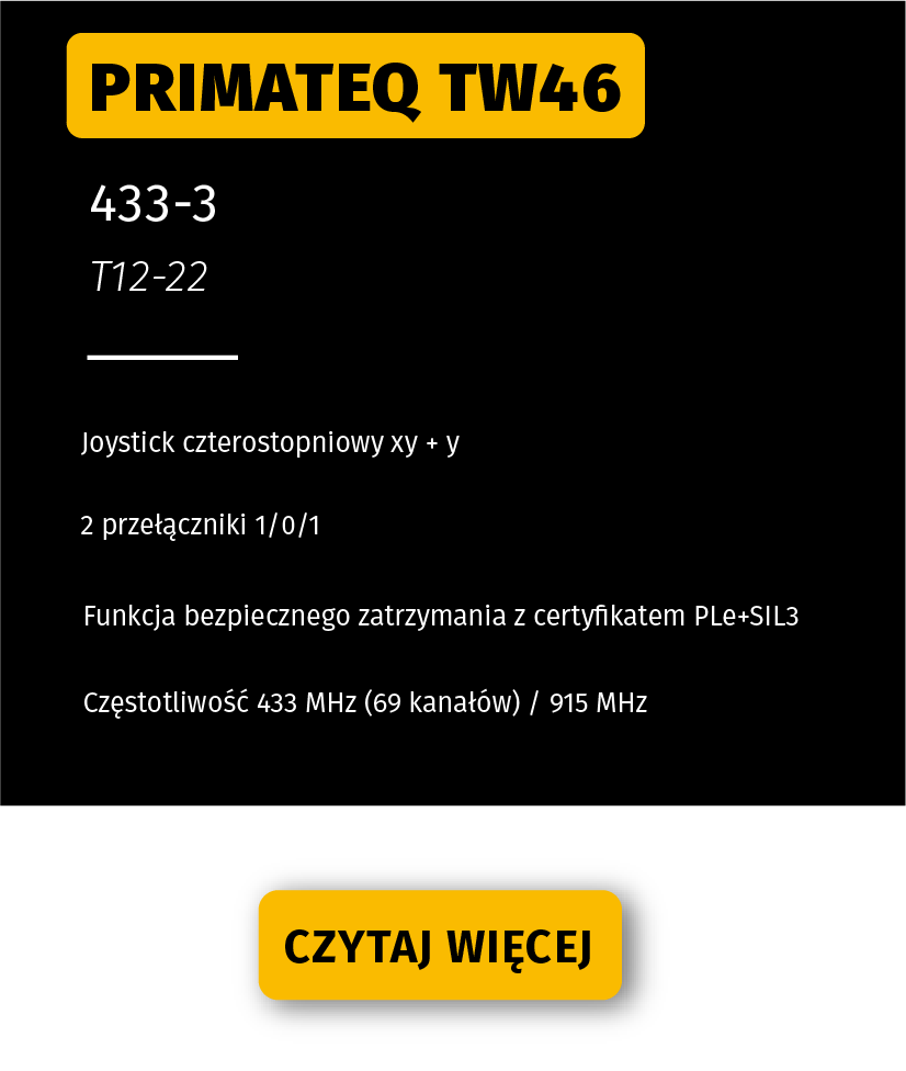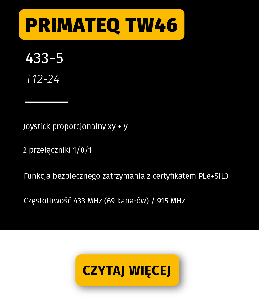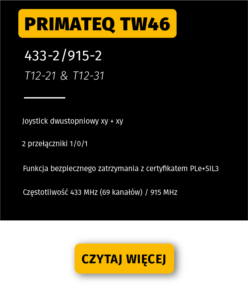 Zdalna obsługa żurawia lub maszyny, a przy tym wolne obie ręce, by móc wykonywać inne zadania – to silne strony nadajników joystickowych, takich jak PrimaTEQ. PrimaTEQ ma 21 cm szerokości i monochromatyczny ekran o wymiarach 4,5 x 1,5 cm. Kompaktowy rozmiar sprawia, że nadajnik jest idealny do długotrwałego użytkowania w trudnych warunkach. Oprócz tego oferuje również solidną obudowę z ergonomicznymi uchwytami, certyfikat od niezależnych jednostek, poziom bezpieczeństwa PLe / SIL3, funkcję bezpiecznego zatrzymania oraz wstępnie zaprogramowane ustawienia dla zastosowań dźwignicowych. Wersja standardowa (Basic Line) obejmuje ponad dziesięć różnych wersji joysticków pracujących na częstotliwości 433 lub 915 MHz. Opcjonalnie, istnieje możliwość zestawienia nadajnika PrimaTEQ zgodnie z życzeniem przy wyborze wersji Custom Line (na zamówienie).