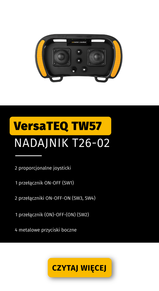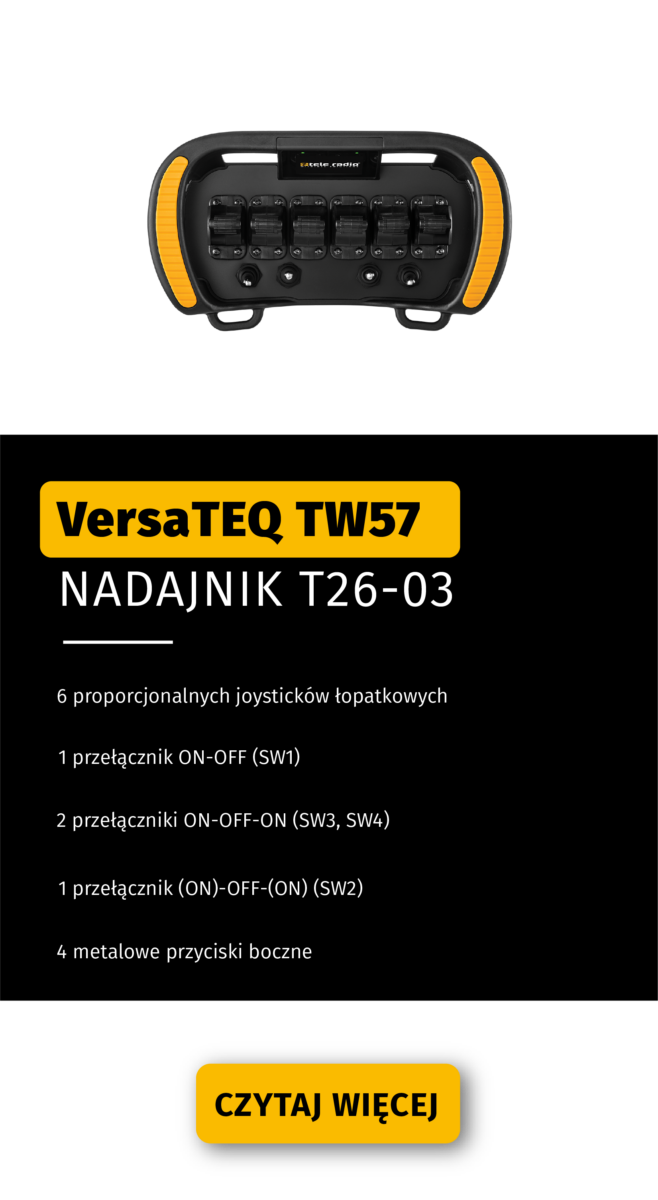 Nasze średnio zaawansowane rozwiązanie dla nadajników z manipulatorami (joystickowych) z wygodną i ergonomiczna konstrukcją. Nadajniki mają szerokość około 24 cm i uchwyty, na których naturalnie układają się dłonie. Aby zagwarantować bezpieczeństwo użytkownika, każdy z nadajników VersaTEQ posiada niezależnie certyfikowaną funkcję zatrzymania awaryjnego na poziomie PLd+Cat3. Sterowanie VersaTEQ jest solidne, wszechstronne i elastyczne, dzięki czemu sprawdzi się w wielu zastosowaniach, m.in. hydraulicznych, mobilnych i przemysłowych.