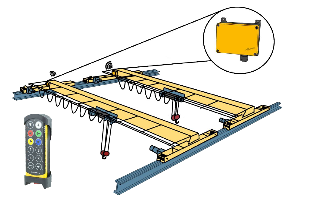 Em aplicações que exigem o içamento de materiais volumosos ou extremamente pesados, é comum a necessidade de operação simultânea de duas ou mais pontes rolantes. Quando elas atuam em conjunto, esse modo é conhecido como “modo tandem”. Nesse cenário, ambas as pontes são geralmente controladas por um único controle remoto, que funciona como transmissor mestre, simplificando a operação e proporcionando maior controle ao operador.