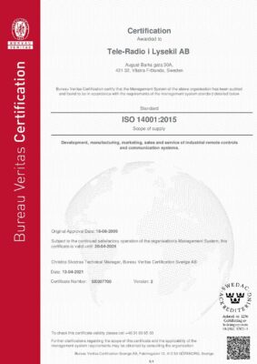 Vi är ISO 9001 kvalitetsledningssystem och ISO 14001 miljöledningssystem certifierade genom Allgon AB multisite certifiering. Det innebär att du kan lita på att vi har de förmågor och kunskap som krävs för att utföra det arbete vi gör. Att vi kontinuerligt arbetar för att förebygga misstag. Och för att förbättra vår miljöprestanda under produktens hela livscykel inklusive utveckling, tillverkning, marknadsföring, försäljning och service av industriella radiostyrningssystem och kommunikationslösningar.