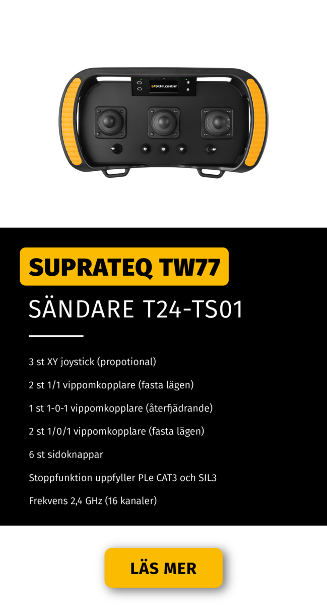 SupraTEQ är vår största midjesändare, den är ergonomiskt utformad, perfekt för långa arbetspass. Tele Radio-design och nyutvecklad teknik i kombination med hållbarhet och tillförlitlighet. SupraTEQ har med sin storlek oanade möjligheter gällande design och utformning. Sändaren har stoppfunktion och är certifierad enligt PLe och SIL3.