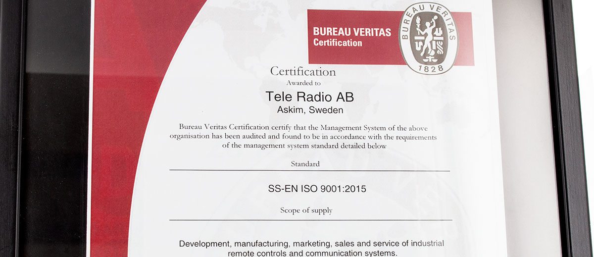 Tele Radio AB is certified according to ISO 9001 quality management system and ISO 14001 environmental management system. This means that you can trust our capacity and knowledge to carry out the work we do, that we continuously work to avoid repeating mistakes, that we use as environmentally friendly components as possible, and use the best means of transport available, both for business travel and for freight transports, for the sake of the environment.
