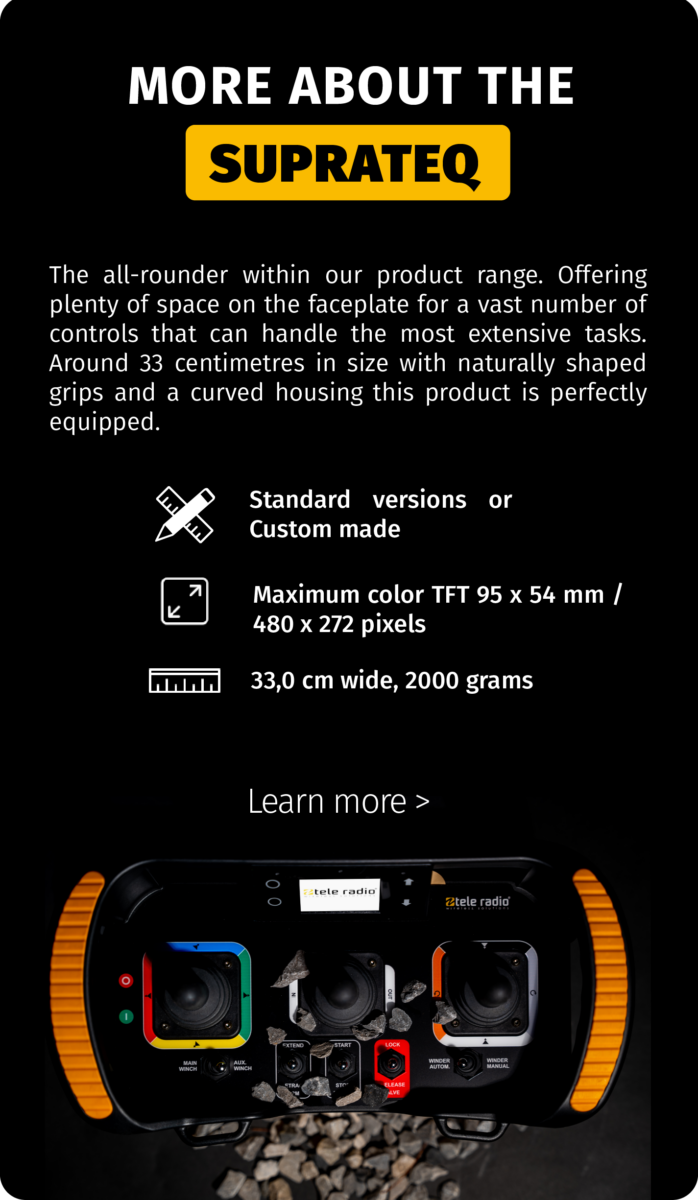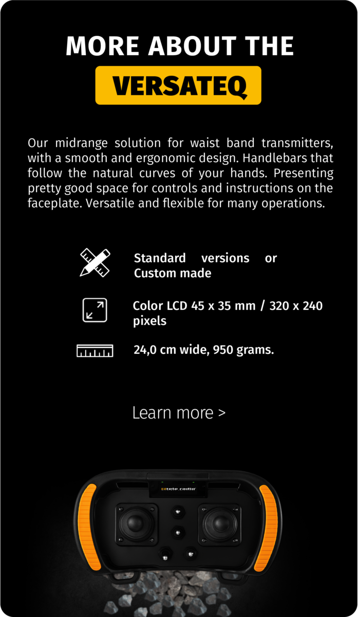 Firstly, are you in need of a belly box transmitter for a (more or less) standard application? Then we recommend that you opt for the VersaTEQ or SupraTEQ Basic Line version. These belly box transmitters have a fixed set of controls, are highly adjustable, have an independently certified emergency stop, and certainly offer the best price/quality ratio.