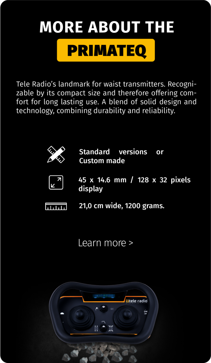 With more than 65 years of experience in the field of wireless industrial control units, Tele Radio has a wide range of transmitters. These waist band transmitters are seamlessly tailored to the exact wishes of the end-user and the specific characteristics of the application.